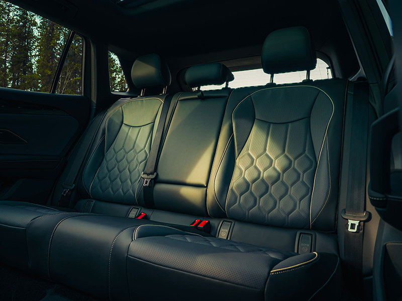 Inside, the Tiguan Turbo sets a new benchmark for the model. Quilted leather seating, open-pore wood trim, and premium materials throughout the cabin create a refined atmosphere. The front seats are ventilated, massaging, and memory-equipped, while the overall layout prioritizes both comfort and functionality.
